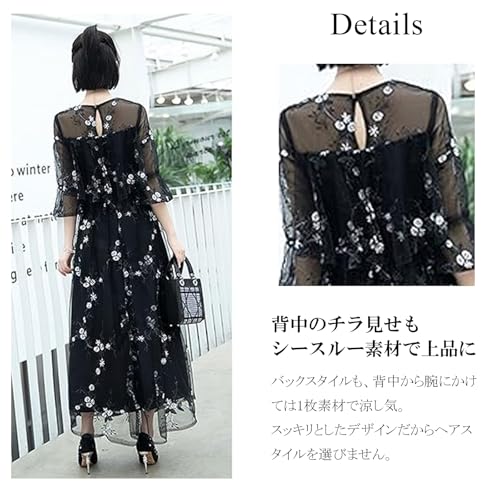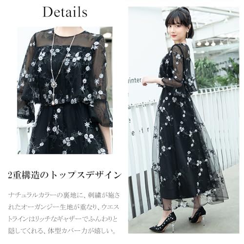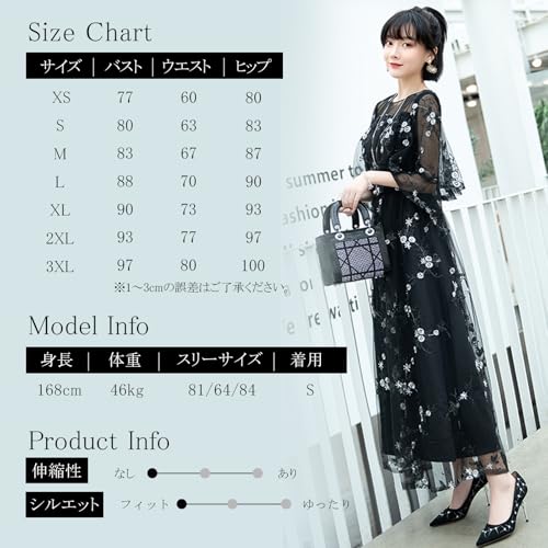 この商品について 【総レースの華やかなパーティドレス】ホワイトの花柄刺繍がオーガンジーのシースルー素材に美しく映える、総レースのパーティドレスです。このドレスはエレガントな雰囲気を持ちつつ、スタイルUPも叶えるパーフェクトなデザインが特徴です。特にパーティや特別なイベントにぴったりのアイテムで、着るだけで華やかさを演出します。カラーやサイズのバリエーションも豊富に揃えており、あなたにぴったりの一着が見つかります。 【考え抜かれたデザイン】上品でエレガントなロング、マキシ丈スカートは、足長効果を高める高いウエストラインが特徴です。さらに、2枚構造の刺繍入りシースルー素材のレイヤードデザインは、他にはない独自の美しさを演出します。どの角度から見ても洗練されたデザインは、周囲の視線を集めること間違いなしです。 【6色のカラバリ】あなたの好みやシーンに合わせて選べる6色のバリエーションを取り揃えています。お手持ちの靴やアクセサリーとコーディネートする楽しさも広がり、おしゃれな装いが完成します。どの色も素敵なものばかりなので、色違いで揃えるのもおすすめです。あなたの個性を引き立てる一着を見つけてください。 【長時間の着用にも適した着心地】ポリエステル素材のさらりとした着心地が魅力のこのドレスは、薄くて軽い生地がフワッと広がり、女性らしいシルエットを演出します。シースルー素材との2重構造により、年中快適な温度を保ち、長時間の着用にも適しています。パーティーやイベントで一日中着ても疲れにくく、快適な着心地を提供します。 【豊富なサイズ展開】このドレスは豊富なサイズ展開を誇ります。バスト/ウエスト/ヒップのサイズは、【XS】77/60/80、【S】80/63/83、【M】83/67/87、【L】88/70/90、【XL】90/73/93、【2XL】93/77/97、【3XL】97/80/100となっています。各サイズごとのフィット感をお楽しみいただけます。※1~3cmの誤差はご了承ください。 続きを見る この商品について