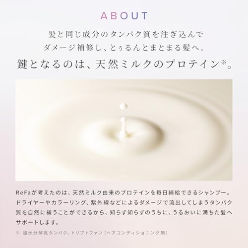 • 【リファミルクプロテインシャンプーピンク】たっぷりのもち泡で、濡れてからまりやすいうねり髪をするすると解きほぐしながら洗えるシャンプーです。コントロールケラチンで髪を補修しながら、天然ミルク由来のプロテイン ※1を補給。しっとりまとまる、きしみの少ないとぅるんな髪へ導きます。