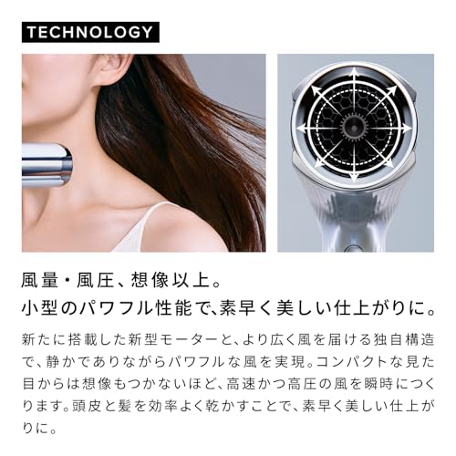 - 【風量・風圧、想像以上。小型のパワフル性能で、素早く美しい仕上がりに】新たに搭載した新型モーターと、より広く風を届ける独自構造で、静かでありながらパワフルな風を実現。コンパクトな見た目からは想像もつかないほど、高速かつ高圧の風を瞬時につくります。頭皮と髪を効率よく乾かすことで、素早く美しい仕上がりに。
