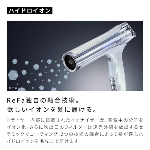 - 【ReFa独自の融合技術。欲しいイオンを髪に届ける】ドライヤー内部に搭載されたイオナイザーが、空気中の分子をイオン化。さらに吹出口のフィルターは遠赤外線を放出するセラミックでコーティング。2つの技術の融合によって髪が喜ぶハイドロイオンを毛先まで届けます。