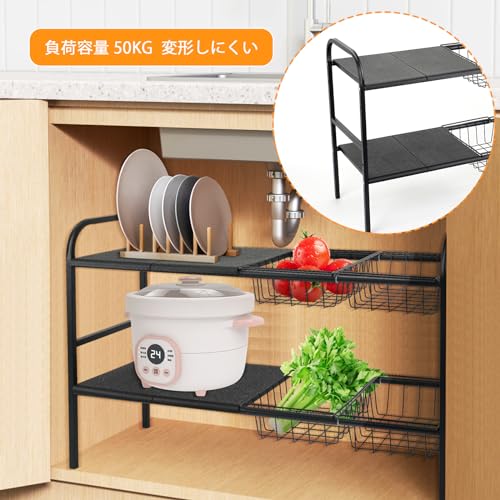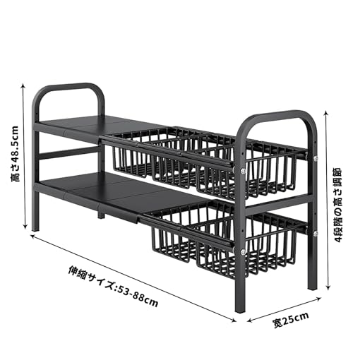 シンク下収納ラック, 洗面台下収納 洗面台下収納 伸縮式, 2段収納 キッチン収納ラック 組み立て簡単 省スペース 収納バスケット5個付き, W 53-88 x D 24.7 x H 48.5 cm. (ブラック)