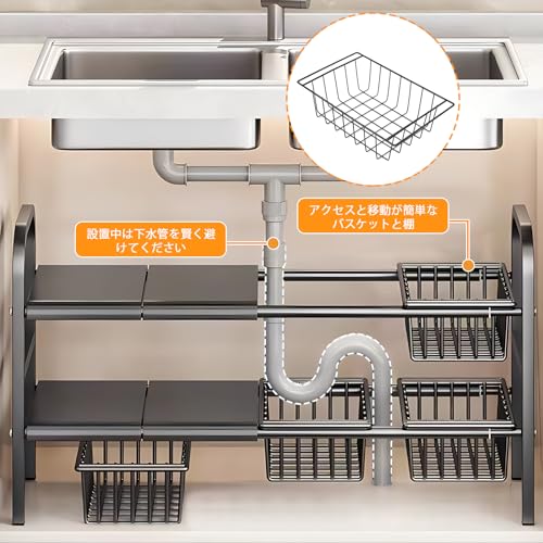 - 製品仕様:幅53-88×奥行25×高さ44cm、収納バスケット:26×16.5×7cm、シンク下伸縮棚は変形しない厚手の素材でできており、丈夫で耐久性があります。キッチン、バスルーム、シンク下、ワードローブなど、あらゆる場所に適しています。鍋やフライパンなどの重いものを収納することができ、変形することなく安全でしっかりしています。