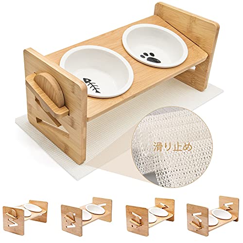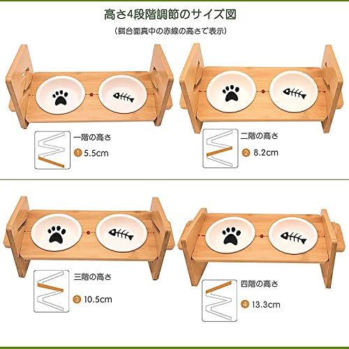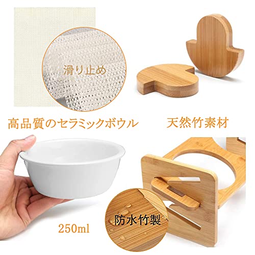 Kito Lee猫 犬用 食器 ペット食器台 猫 犬用 フードボウル 水ボウル 陶器皿250ML*2個 傾斜15度 頸椎を保護 天然竹 高さ調節可能 4段階 滑り止めパッド付き
