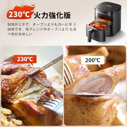 - 【よりサクサクした食感】このエアフライヤーは、230°Cまでの業界をリードする温度で調理され、これまでになく効率がさらに向上します。これに基づいて調理時間を短縮し、電気代の節約にもつながります。その上に、230℃の温度でお肉の中身がジューシー、外はサクッとした食感に仕上がります。カロリーを抑えながらカラッと揚げ物が食べられます。