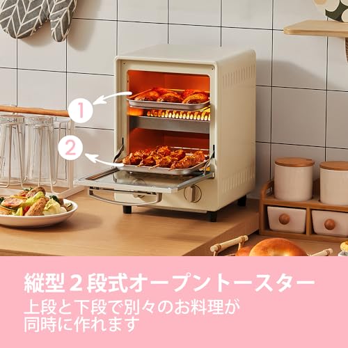 COMFEE' オーブントースター 縦型 8L トースト2枚焼き 上下ヒーター搭載 1000W15分タイマー 焼きムラ抑え スライドオープンドア パンくずトレイ1枚・受け皿2枚付き スリム レトロ CF-MF082-AY アイボリー