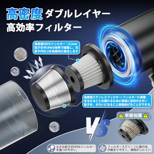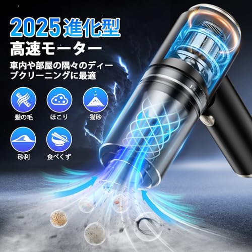 【25000Pa強力吸引】ボールベアリング式高速モーターを搭載したハンディ掃除機は、強力な吸引力で手にくっついて離れないので、髪の毛、隅のホコリ、食べ物の残りかす、タバコの吸い殻、足の汚れ、猫砂などを一気に取り除きます。独自のノイズ低減技術により、騒音は65デシベル以下に抑えられ、いつでも使用可能。頑丈なスナップ機構により、アクセサリーをしっかりと固定でき、落下の心配がないです。