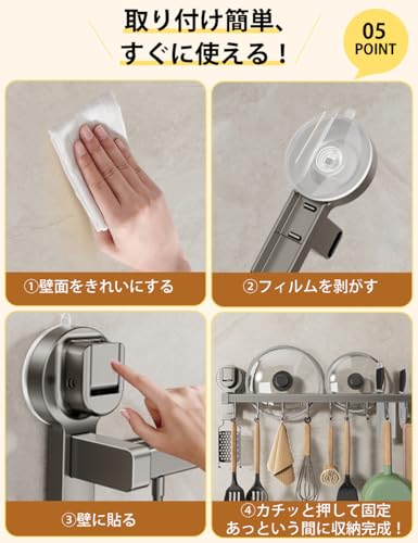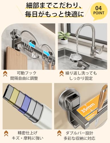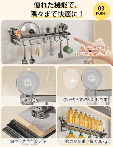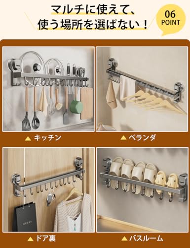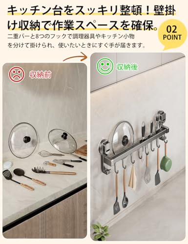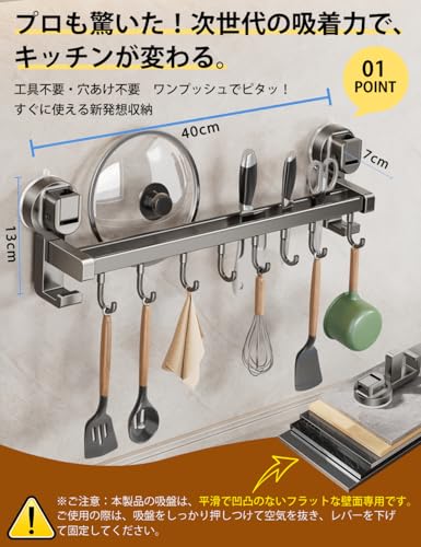 キッチンツールフック 【革新の強力吸盤 ダブルバー 可動式フック】 cラック 吸盤式 強力吸着 アルミニウムとABS製 耐荷重最大30kg 台所ラック 台所収納 強い収納力 軽量 穴あけ不要 キッチンツール 壁掛け 防水 防錆 防油 バスルーム/リビング/ベランダなどに適用 (黒 40CM)